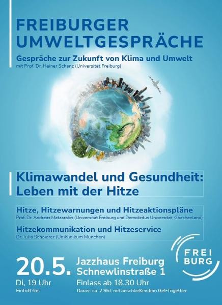 „Klimawandel und Gesundheit: Leben mit der Hitze“ lautet das Thema der nächsten „Freiburger Umweltgespräche“, zu welcher die Stadt Freiburg und die Fakultät für Umwelt und Natürliche Ressourcen der Universität Freiburg am Dienstag, 20. Mai, um 19 Uhr einladen. Die Veranstaltung findet im Jazzhaus Freiburg statt. Der Einlass beginnt um 18.30 Uhr. Der Eintritt ist frei.